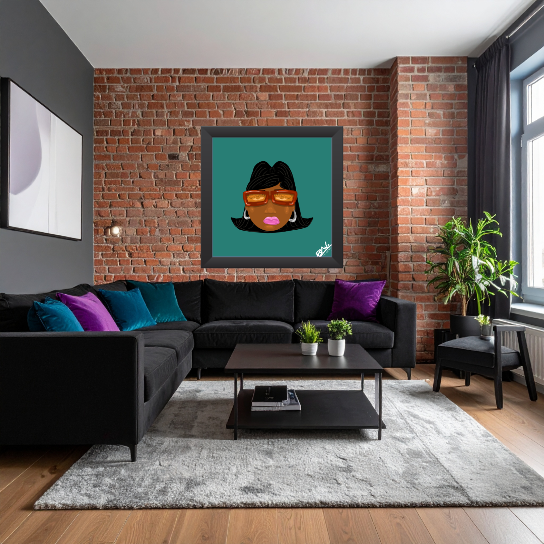 A bold, gallery-ready fine art poster that celebrates confident, modern style. Warm brown skin tones and oversized amber sunglasses sit against a deep teal field, creating a striking, minimalist portrait that feels both playful and poised. Printed using giclée techniques and REACH-certified inks on acid-free 220 gsm gallery paper, the matte surface keeps colors rich and reflections low — perfect for framed displays or pared-back wall arrangements. Available in multiple orientations and sizes, this piece brings a calm, stylish presence to living rooms, studios, or entryways where curated, personality-driven art matters.